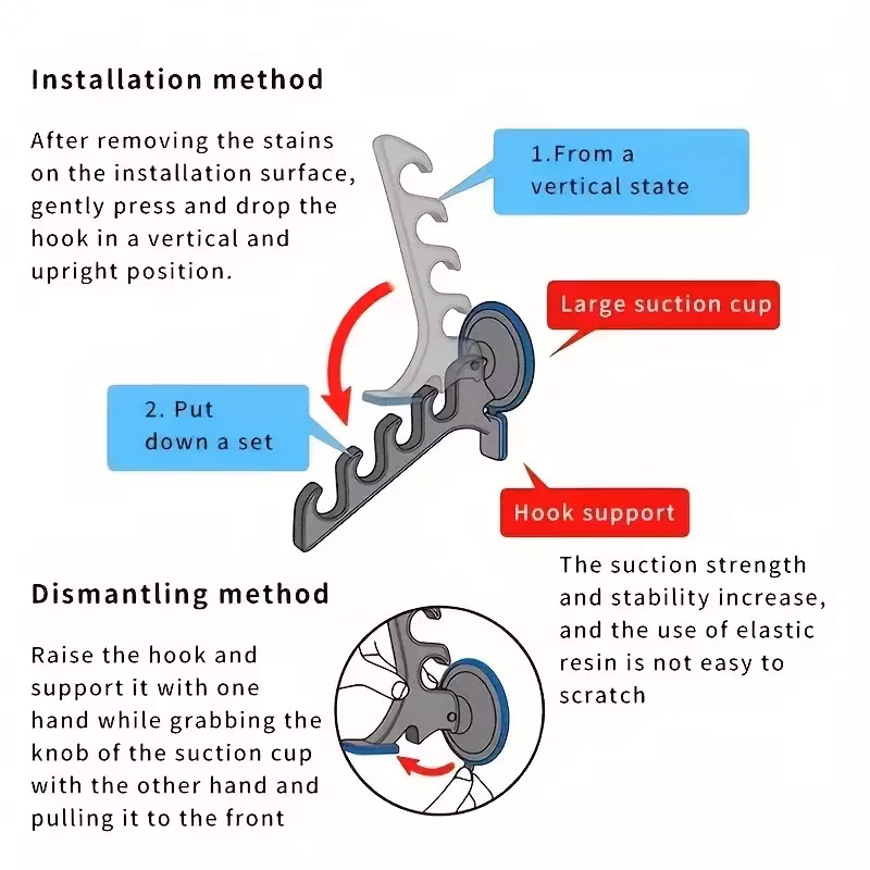 Fäster på de flesta material. Glas, Hårdplast m.m. Rengör/Torka av ytan, innan spöhållarna fästes fast.