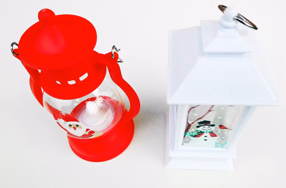 Sätt stämningen med dessa festliga lyktor. Den röda lyktan har en jultomte inuti, medan den vita lyktan visar en snögubbe och en fågel.