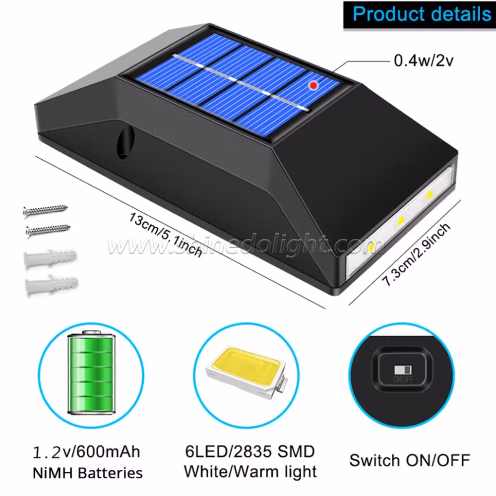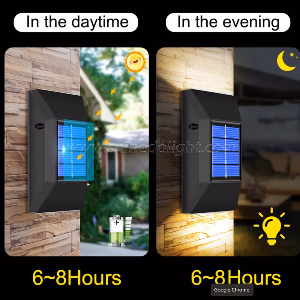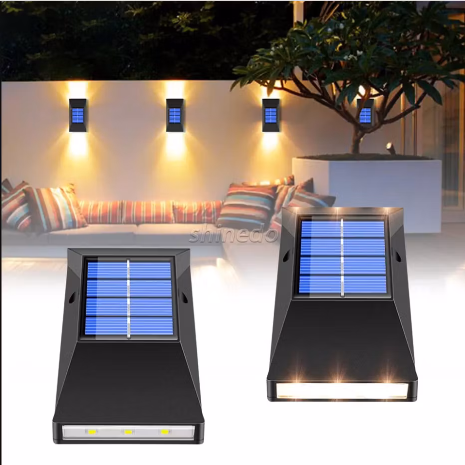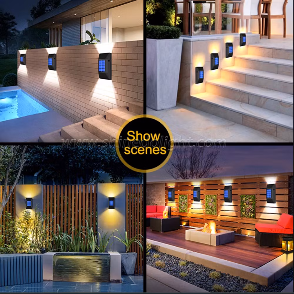 Fasad/Vägg Ute/Innebelysning med solceller 2-4 pack. Lyser upp trädgården, uteplatsen, altan med solcelladdade lampor under dagtid som sedan automatiskt tänds när det blir mörkt. En väldigt stämningsfull solcells utebelysning där fasad lamporna lyser upp under kvällen och natten. Slipp tänka på att ladda eller byta batterier eftersom batteriet laddas upp via solceller. Kan även användas inomhus.