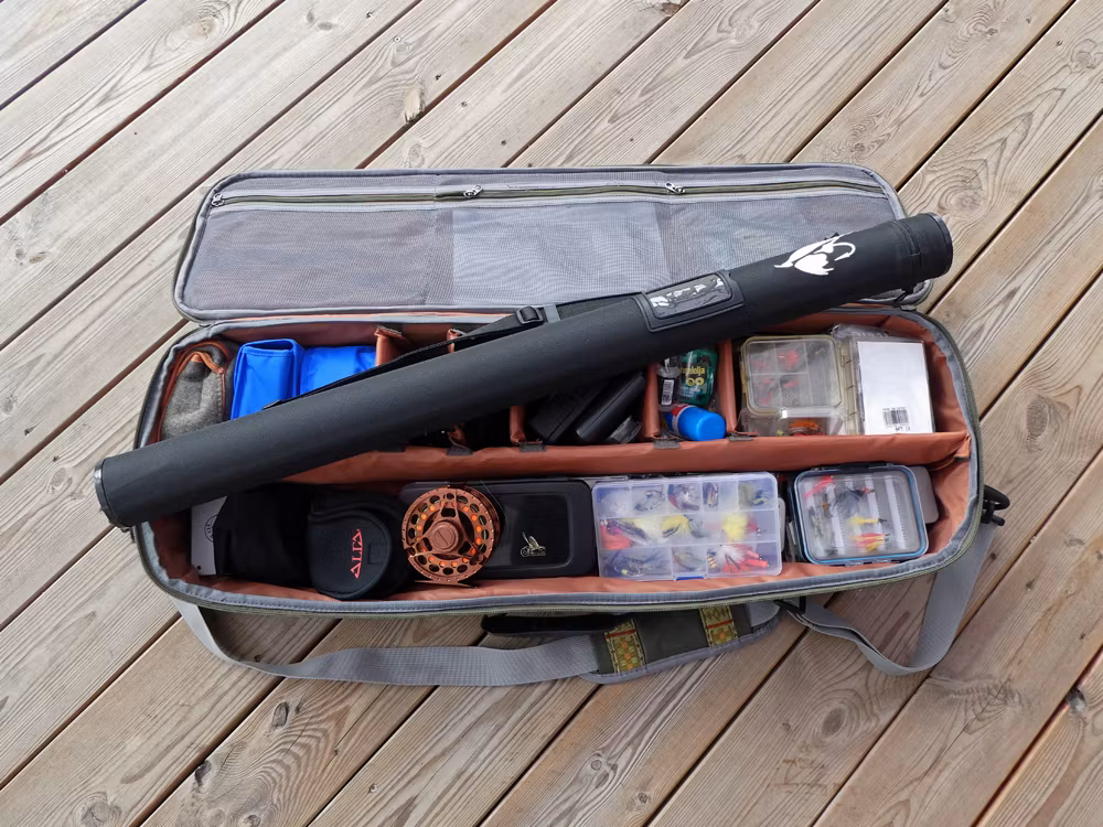 Fiskeväska av högsta kvalitet, som sväljer de mesta av fiskeprylar. Massor med olika fickor, in och utvändigt. Typ, Orvis Carrie in All. (Pris 3799:-) Prylarna ingår ej.